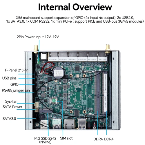 Front-Panel Connectors: Power on/off, 4 x USB 3.0, 1 x H-DMI, 1*COMRear-Panel Connectors: 6 x LAN (RJ45 Ports 2.5GbE Adaptive), 1x DC-IN 12V