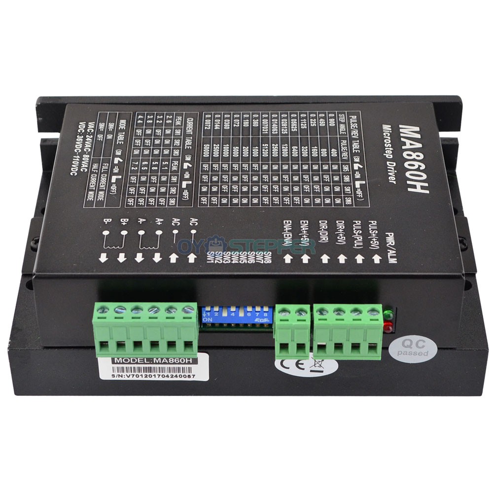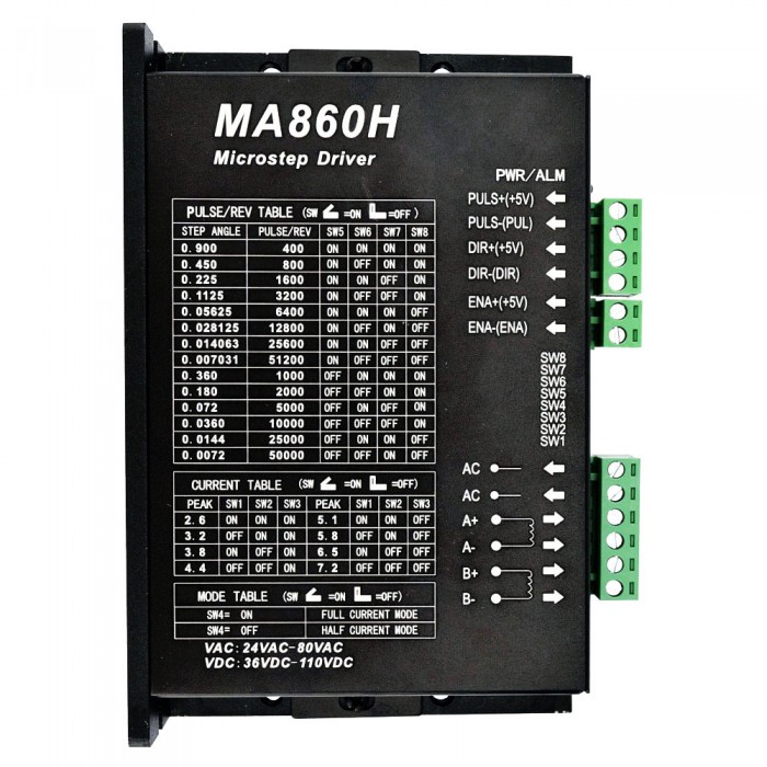 Có thể sử dụng để điều khiển động cơ 2 pha hoặc 4 pha (từ kích thước Nema 17-Nema 42) với ít tiếng ồn và nhiệt hơn. Hoạt động với điện áp 36-110VDC/24-80VAC và có thể cung cấp dòng điện cực đại tối đa 7,2A. Bạn có thể cài đặt công tắc DIP để có được dòng điện và bước vi mô mà bạn cần.