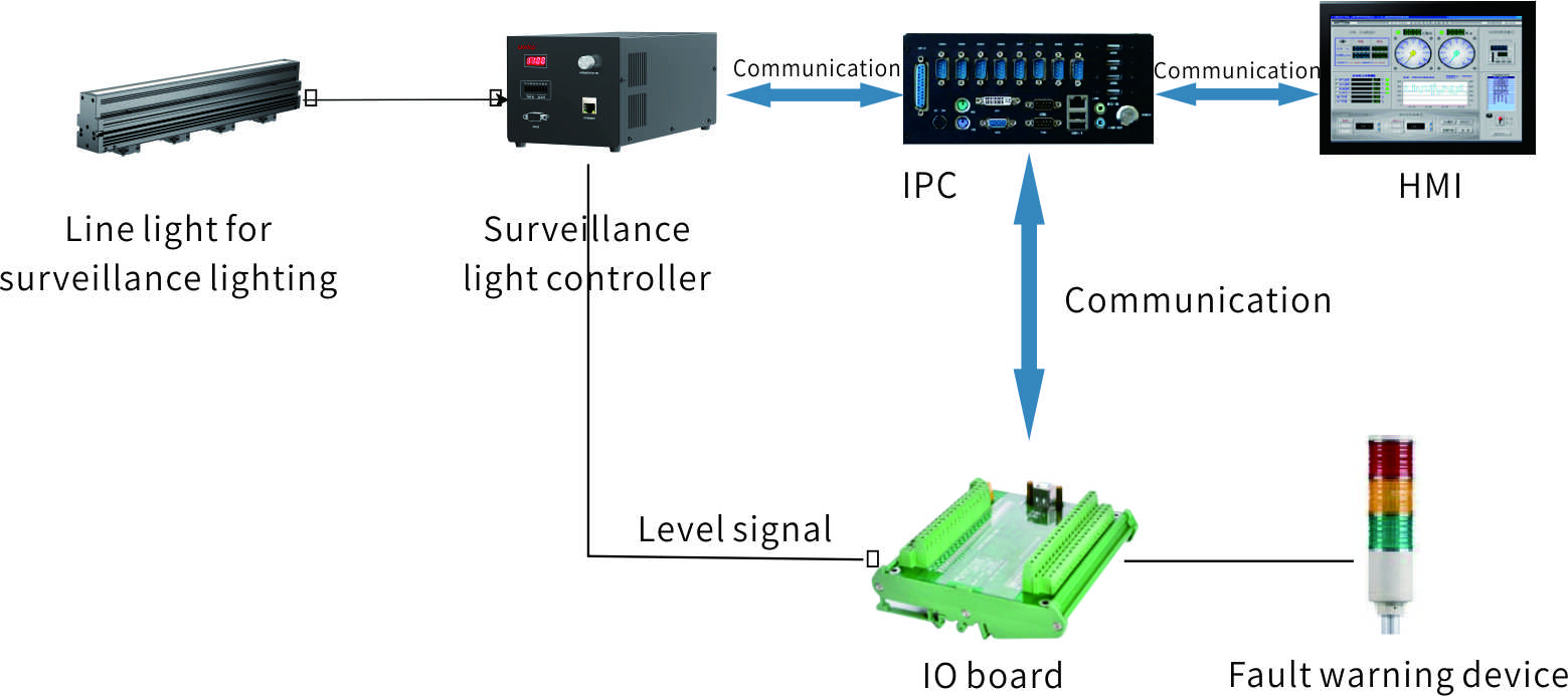 Monitor operating status, illuminance and temperature of LEDs, the operation of fans, the operating time of lights and controllers, etc., and the real-time warning and alarm against faults avoids lighting system operating in an exceptional state, thereby preventing defective products being omitted and flawless products being over-detected, which helps improve the reliability of the inspection system.