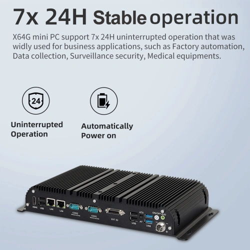 This Industrial Mini Pc supports 7x 24H uninterrupted operation, and auto power on. It is