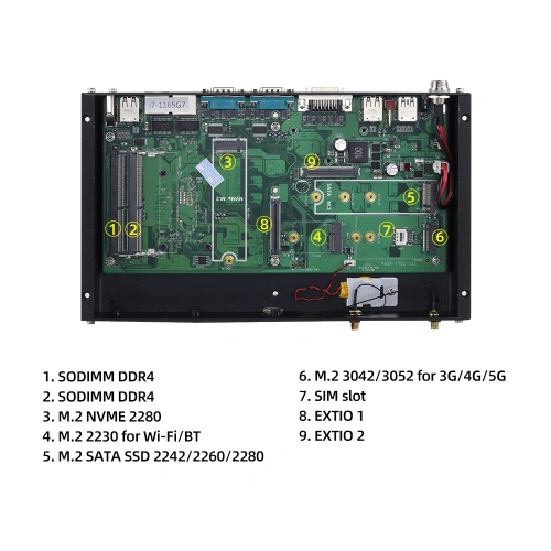 This fanless mini industrial PC has dual DDR4 RAM slots, one M.2 NVME 2280 slot, and one M.2 NGFF slot.